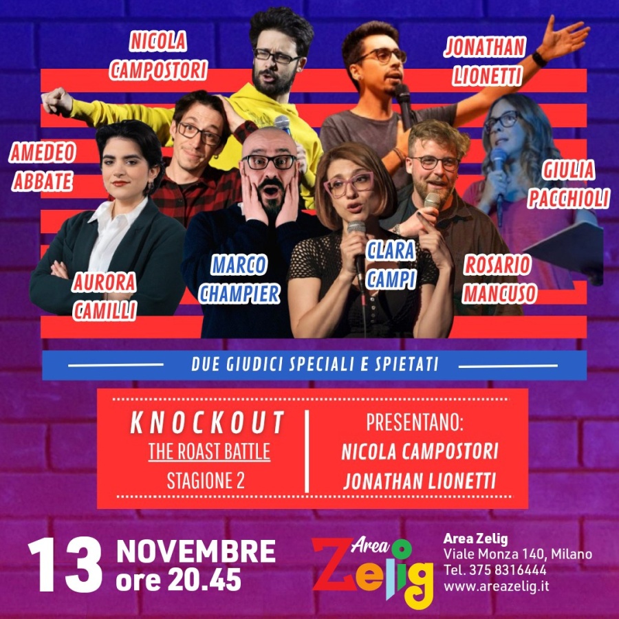 Knockout • The Roast Battle! è (uno spettacolo!) un torneo di Stand Up Comedy, dove 32 comici si sfidano sul ring di Area Zelig con l’obiettivo di prendere in giro il proprio avversario in maniera ironica, schietta e divertente!