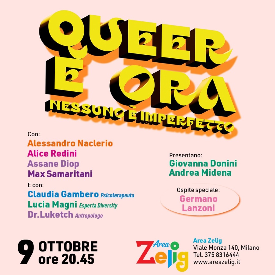 QUEER E ORA ideato e scritto da Giovanna Donini e Andrea Midena è un nuovo format comico dove si esibiranno e si alterneranno sul palco tante persone “strane, bizzarre, eccentriche, insolite” insomma orgogliosamente QUEER che affronteranno con e senza ironia temi sensibili legati alla diversità e all’inclusione.